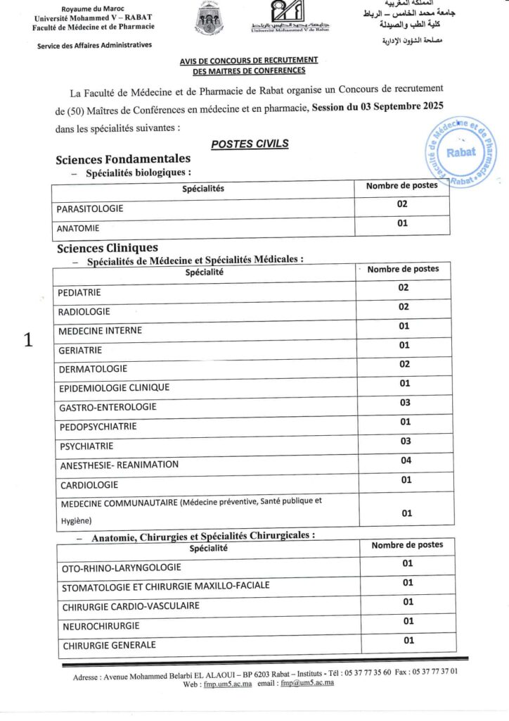 L’Université Mohammed V UM5 organise un concours pour le recrutement de 50 Maîtres de Conférences.