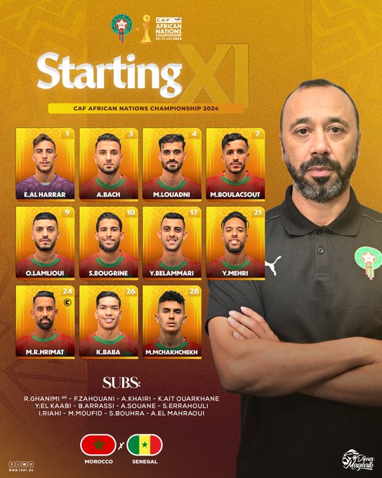 كشف الناخب الوطني طارق السكتيوي عن التشكيلة الرسمية التي سيخوض بها المنتخب المغربي المحلي المباراة اليوم أمام منتخب السنغال ضمن منافسات نصف نهائي الشان. وفيما يلي التشكيلة: