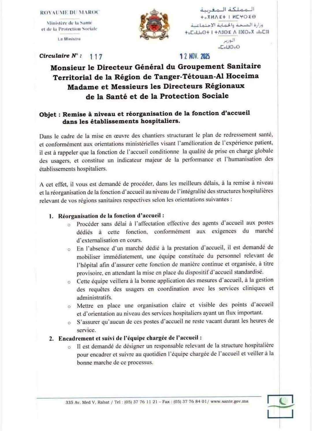 واختتمت الوزارة مراسلتها بالتأكيد على أن تحسين نظام الاستقبال داخل المستشفيات يشكل خطوة محورية نحو الارتقاء بالخدمات الصحية، مشددة على أن أي انحراف عن المهام المحددة أو إسنادها لأشخاص غير مؤهلين لن يُسمح به تحت أي ظرف.