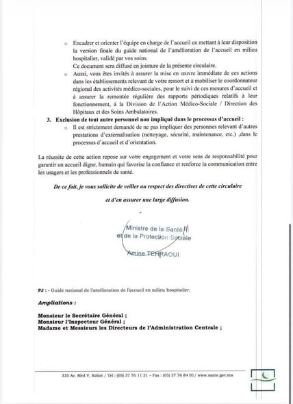 كما نصّت الوثيقة على ضرورة تعيين مسؤول داخل كل مؤسسة استشفائية للإشراف اليومي على فريق الاستقبال وتتبع جودة أدائه، مع إلزامه بضمان تمكين هذا الفريق من النسخة النهائية للدليل الوطني لتحسين خدمات الاستقبال في المستشفيات، باعتباره مرجعاً أساسياً لرفع مستوى هذه الخدمة الحيوية.