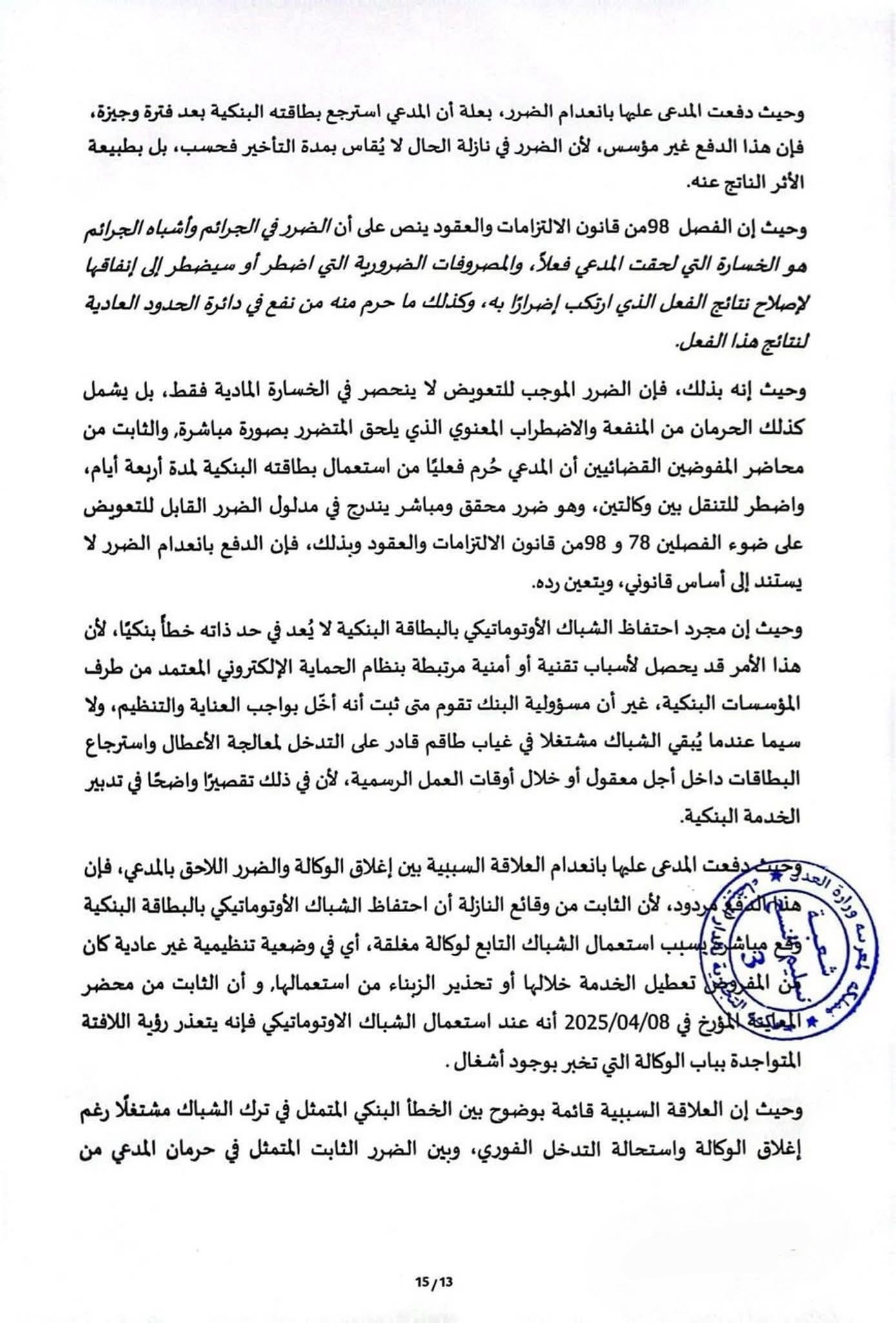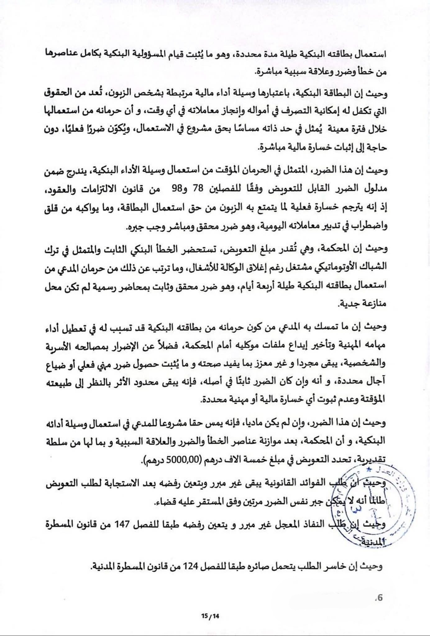 وبناءً على ذلك، قضت المحكمة بتحميل البنك المسؤولية الكاملة عمّا نتج عن هذا الخطأ التنظيمي من أضرار مادية ومعنوية لحقت بالزبون، مع الإقرار بأن تعطيل البطاقة طيلة أربعة أيام شكّل مساسًا بحقوقه المالية وتعطيلًا لخدمات أساسية.